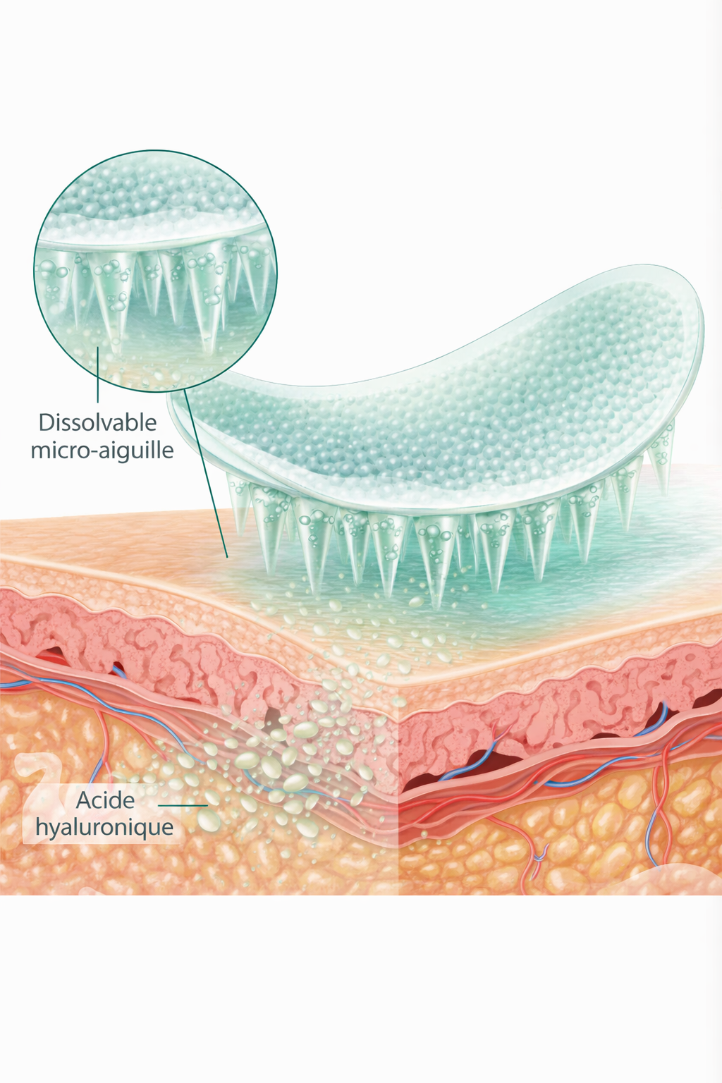 Les patchs utilisent des micro-aiguilles solubles, conçues pour pénétrer la couche superficielle de la peau puis se dissoudre progressivement au contact de l’humidité cutanée, sans douleur ni lésion.➡️ Cela permet une action ciblée, sans injection.